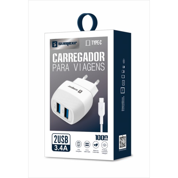 Kit Carregador com 2 saídas USB 3.4A + Cabo TYPE-C, modelo: Sumexr SX-F50-C